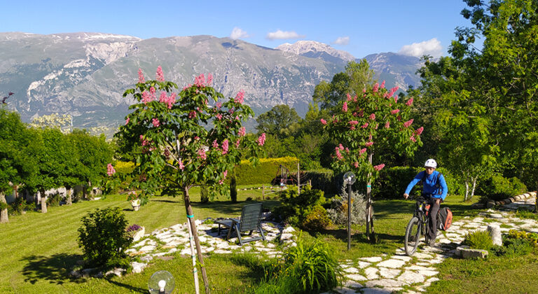 Dopo che nella prima parte avevamo pedalato da Ortona verso l’entroterra, ora si torna verso il mare. Se vorrete fare tutti i 207 km della Linea Gustav in quattro tappe, può essere utile pernottare a Torricella Peligna. Non lontano da qui, in località Fallascoso, l’Agriturismo e B&B Persichitti offre un’abbondante colazione sia dolce che salata, ottima per ricaricare le energie in vista di nuovi chilometri da percorrere in sella. La struttura è ben curata, isolata nel verde e soprattutto davanti a sé ha la maestosità della Maiella. Il vento che la sera la avvolge, fischiando, porge l’occasione per ricordare la leggenda che dà il nome al massiccio, che si perde nella notte dei tempi. La riportiamo così come ce l’ha raccontata la nostra guida Andrea D’Addario di Bikexplora.La ninfa Maja ebbe il figlio Ermes ferito in battaglia. Dopo una lunga fuga, approdò con lui in queste zone, alla ricerca di un’erba miracolosa che avrebbe potuto salvarlo. Lasciò il figlio in una grotta mentre lei era alla ricerca di questa pianta salvifica ma, al ritorno, lo trovò esanime. Per il dolore si lasciò morire anche lei ed i pastori, impietositi, la seppellirono proprio su queste montagne che prendono il suo nome. Da allora si dice che il profilo della Maiella sembra quello di una donna pietrificata che guarda verso il mare…